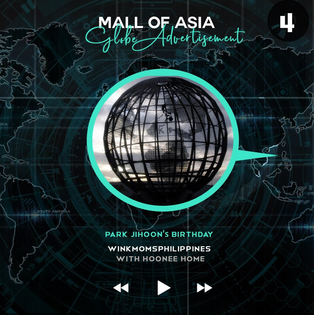 Wink Around the Globe was a series of ads around SM Mall of Asia, the concert venue, to exhibit Park Jihoon’s ethereal beauty and charms. It was composed of 2 solo Mall of Asia Globe Ads by @eyesnoselips9 with @angelwinkies of WinkMomsPH and @romanticspotjh; 1 duo Mall of Asia Globe Ads by @sugarrush9699, @angelwinkies and @peachpurffect12; 1 group Mall of Asia Globe Ads by Filipino Wannables, @wnbsupportMNL, @wannaonePHIL and @enjoyGLOBE; 2 MAAX Eye Led Ads by @HoonSpirit0529 with @supporjtpjhph and @Hooneehome with @Island990529.