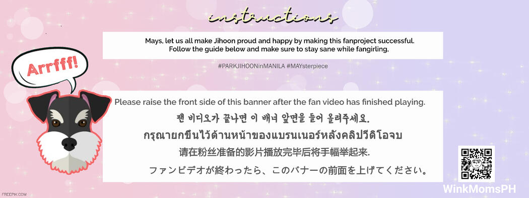 Instructions in English, Korean, Thai, Chinese and Japanese were written at the back of the banner. A QR code which when scanned directs to this site was also placed to introduce the different fan projects of Wink Moms Philippines for Park Jihoon.