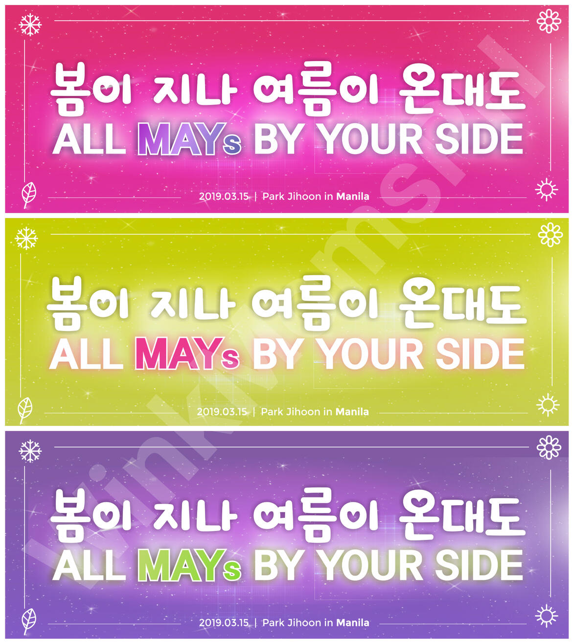 Inspired with Park Jihoon’s First Edition poster, this banner event featured the colors used in it - pink, violet and neon green. The banner design has the symbols for summer, autumn, winter and spring in the corners, to signify our love and support for Park Jihoon all throughout the seasons. Thus, connecting to our banner message and inspired by Park Jihoon's song, Young 20, that “even when spring passes by and summer comes”, we will always, all MAYs, be by his side. All MAYs is also a play on the word always and may also mean each and every MAY. This banner event was executed after the fan video which further emphasized that no matter which sides Park Jihoon chooses to show, MAYs will always be by his side to support him.